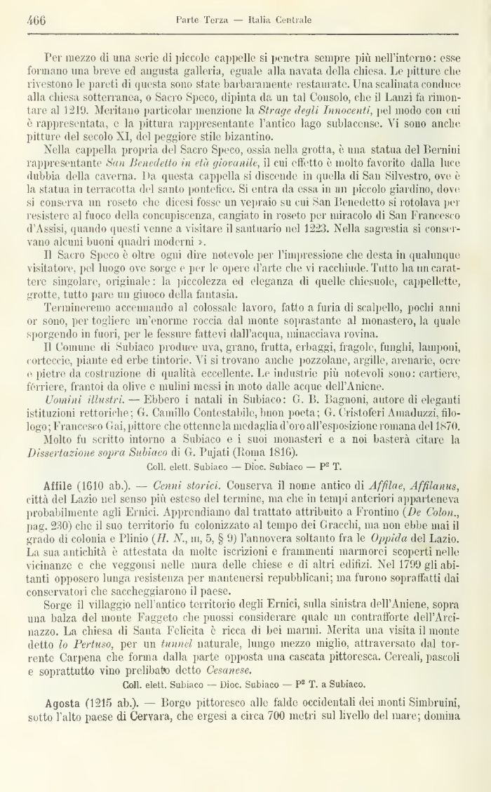 Molto fu scritto intorno a Subiaco e i suoi monasteri e a 1101 basterà citare la Dissertazione sopra Subiaco di G. Pujati (Iìonia 1816).