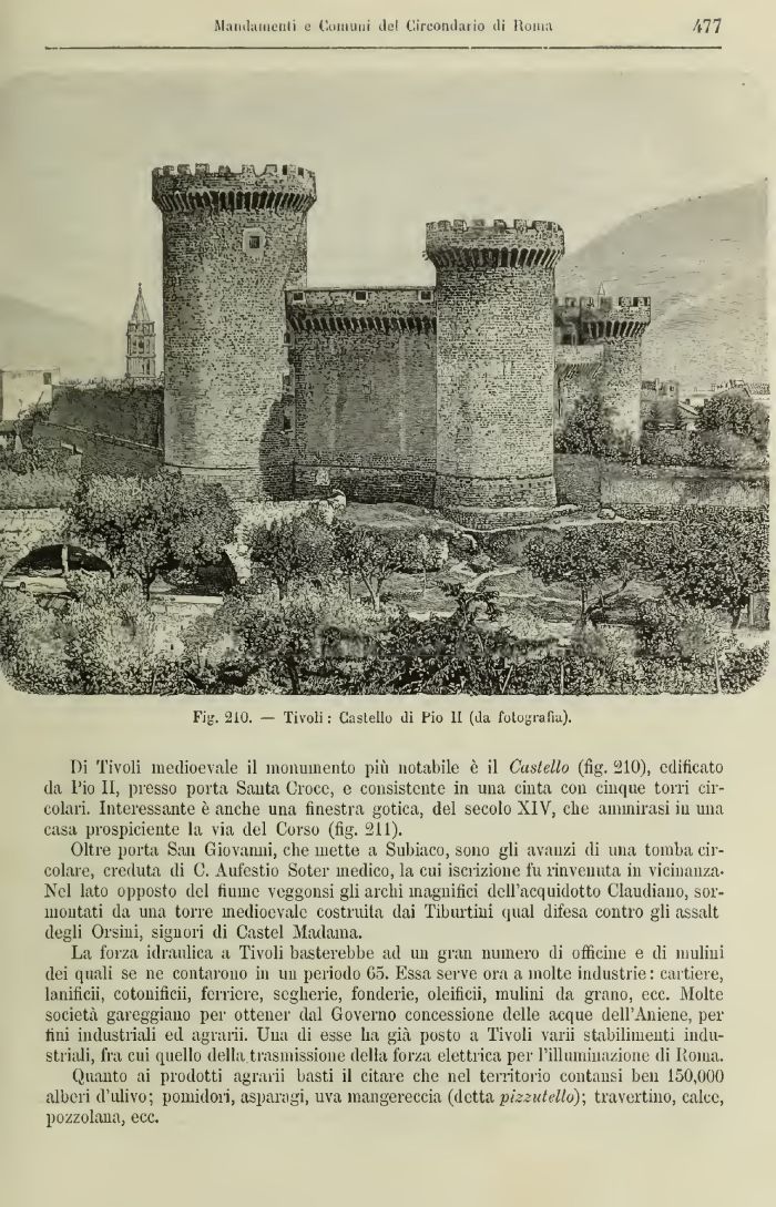 Di Tivoli medioevale il momunento più notabile è il Castello (fig. 210), edificato da l'io II, presso porta Santa Croce, e consistente in una cinta con cinque torri circolari. Interessante è anche una finestra gotica, del secolo XIV, che ammirasi in una casa prospiciente la via del Corso (fig. 211).