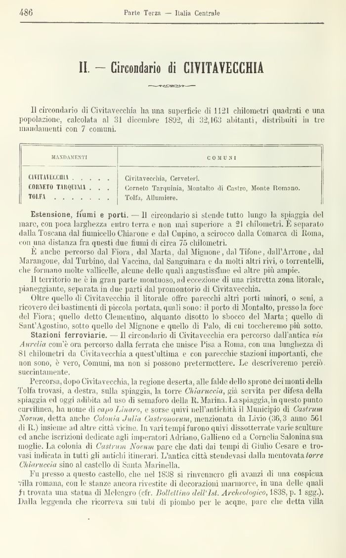 Il circonda ria di Civitavecchia ha una superficie di 1121 chilometri quadrati e una popolazione, calcolata al 31 dicembre 1892, di 32,1G3 abitanti, distribuiti in tre mandamenti con 7 comuni.