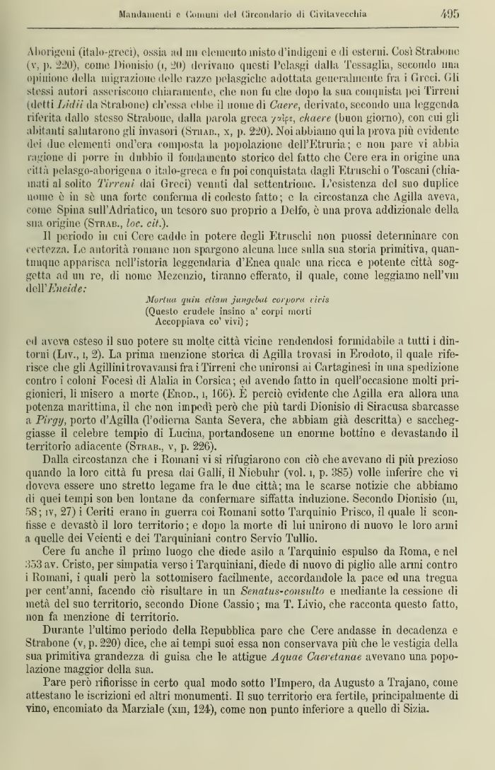 ed aveva esteso il suo potere su molte città vicine rendendosi formidabile a tutti i dintorni (Liv., ì, 2). La prima menzione storica dì Agilla trovasi in Erodoto, il quale riferisce che gli Agillinitrovavansi fra i Tirreni che unironsi ai Cartaginesi in una spedizione contro i coloni Focesi ili Alalia in Corsica; ed avendo fatto in quell'occasione molti prigionieri, li misero a morte (Erod., l 1GG). E perciò evidente che Agilla era allora una potenza marittima, il che non impedì però che più tardi Dionisio «li Siracusa sbarcasse a Pirgy, porto d'Agilla (l'odierna Santa Severa, che abbiam già descritta) e saccheggiasse il celebre tempio di Lucina, portandosene un enorme bottino e devastando il territorio adiacente (Stoab., v, p. 226).