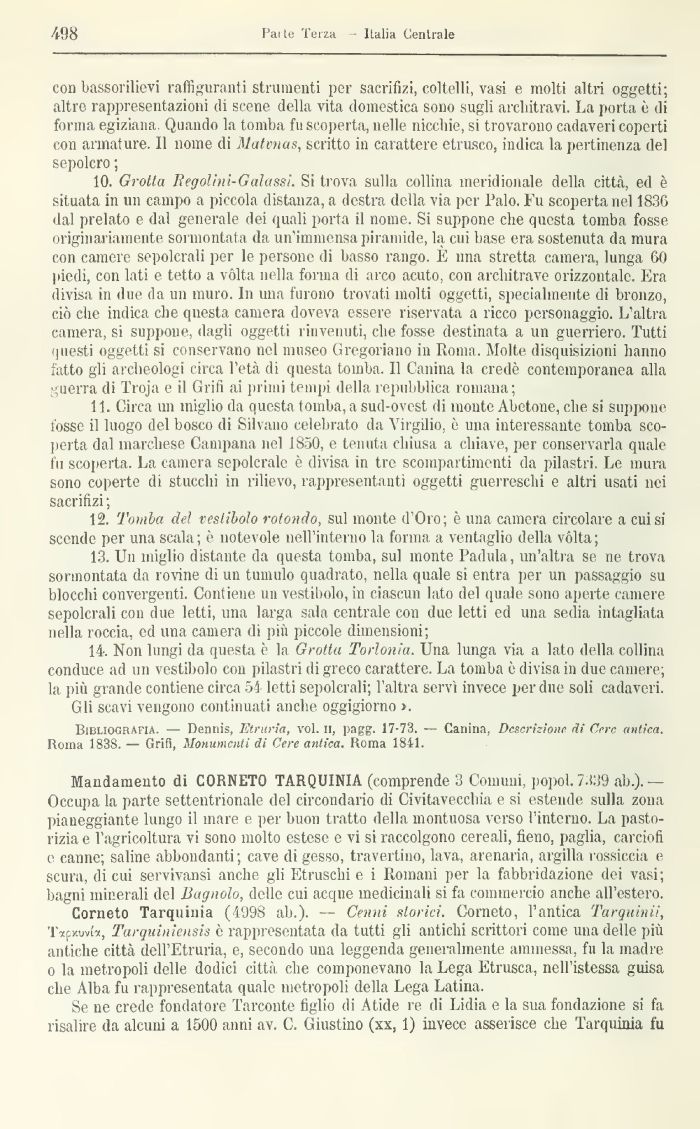 10. Grotta Eegolini-Galassi. Si trova sulla collina meridionale della città, ed è situata in un campo a piccola distanza, a destra della via per l'alo. Fu scoperta nel 1836 dal prelato e dal generale dei quali porta il nome. Si suppone che questa tomba fosse originariamente sormontata da un'immensa piramide, la cui base era sostenuta da mura con camere sepolcrali per le persone di basso rango. E ima stretta camera, lunga 60 piedi, con lati e tetto a vòlta nella forma di arco acuto, con architrave orizzontale. Era divisa in due da un muro. In una furono trovati molti oggetti, specialmente di bronzo, ciò che indica che questa camera doveva essere riservata a ricco personaggio. L'altra camera, si suppoue, dagli oggetti rinvenuti, che fosse destinata a un guerriero. Tutti questi oggetti si conservano nel museo Gregoriano in Roma. Molte disquisizioni hanno fatto gli archeologi circa l'età di questa tomba. Il Canina la credè contemporanea alla guerra di l'roja e il Grifi ai primi tempi della repubblica romana;