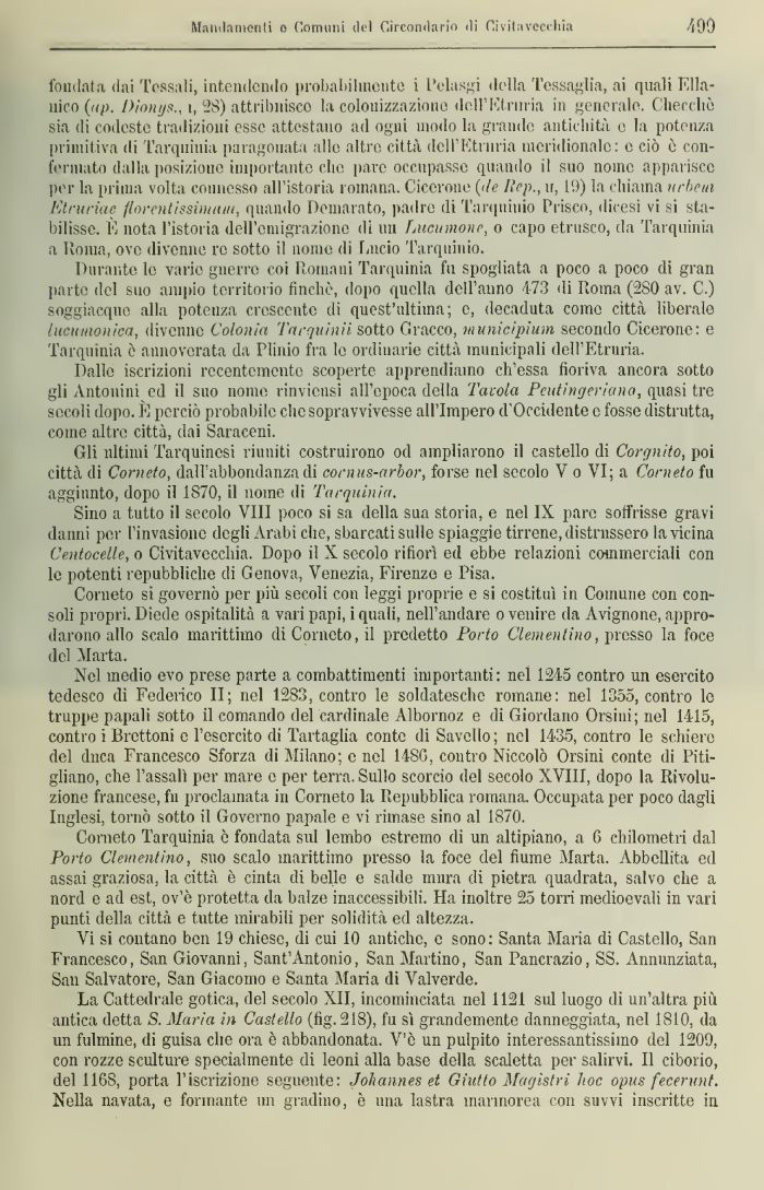 Corneto Tarquinia ò fondata sul lembo estremo di un altipiano, a 6 chilometri dal Porto dementino, suo scalo marittimo presso la foce del fiume Marta. Abbellita ed assai graziosa, la città è cinta di belle e salde mura di pietra quadrata, salvo che a nord e ad est, ov'ò protetta da balze inaccessibili. Ha inoltre 25 torri medioevali in vari punti della città e tutte mirabili per solidità ed altezza.