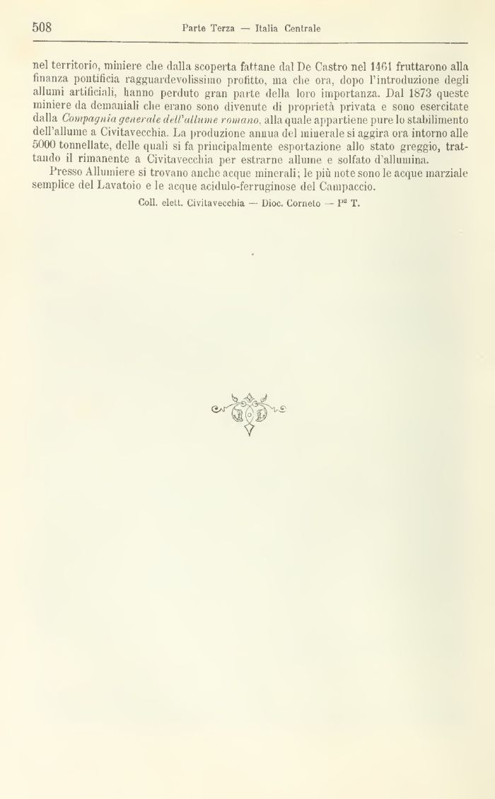 nel territorio, miniere clie dalla scoperta fattane dal De Castro nel 1461 fruttarono alla finanza pontificia ragguardevolissimo profitto, ma che ora, dopo l'introduzione degli allumi artificiali, hanno perduto gran parte della loro importanza. Dal 1873 queste miniere da demaniali che erano sono divenute di proprietà privata e sono esercitate dalla Compagnia generale dell'allume romano, alla quale appartiene pure Io stabilimento dell'allume a Civitavecchia. La produzione annua del minerale si aggira ora intorno alle 5000 tonnellate, delle quali si fa principalmente esportazione allo stato greggio, trattando il rimanente a Civitavecchia per estrarne allume e solfato d'allumina.