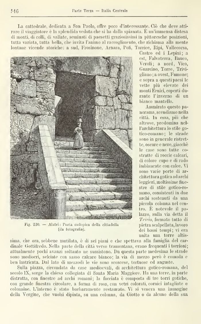 Ammirato questo panorama, scendiamo nella città. In essa, piti che altrove, predomina nell'architettura lo stile gotico-romano ; le strade sono in generale ristrette, oscure e nere, giacche le case sono tutte costrutte di roccie calcari, di colore cupo e di rado imbiancate con calce. Vi sono varie porte di architettura gotica ad archi leggieri, moltissime finestre di stile gotico-romano, consistenti in due archi sostenuti da una piccola colonna nel centro. È notevole il palazzo, sulla via detta il Tri'io, formato tutto di Fig. 220. — Alatri: Porta ciclopica della cittadella pietra Scalpellata, lavoro