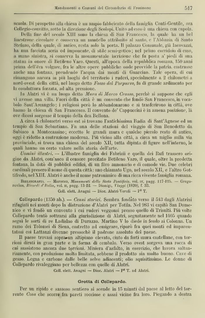 Collepardo (1350 ab.). — Cenni storici. Sembra fondato verso il 513 dagli Alatrini rifugiati nei monti dopo la distruzione d'Alatri per Potila. Nel 983 vi capitò San Domenico e vi fondò un convento i cui ruderi veggonsi presso quello di Trisulti. Più volte Collepardo tentò sottrarsi alla giurisdizione di Alatri, segnatamente nel 1405 quando seguì le sorti di re Ladislao di Durazzo. Martino V lo diede in feudp ai Colonna. Un ramo (lei Polonici di Siena, costretto ad emigrare, riparo fra quei monti ed imparentatosi coi Lattanzi divenne pressoché il padrone assoluto del paese.