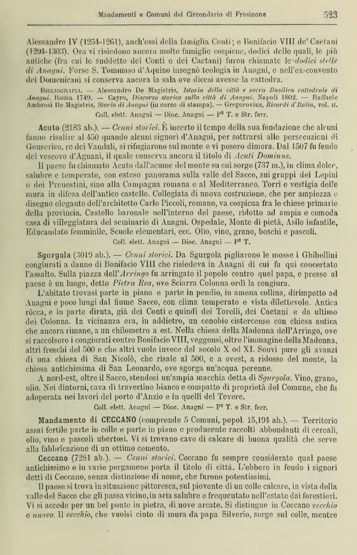 lìuìt.iotatAfiA. — Alessandro De Magistris, Istoria delia città e sacra Basilica cattedrale di Anagni. Itoma ITU). — Cayro, Discorso storico sulla città di Anagni. Napoli 1802. — Raffaele Ambrosi De Magistris, Storia di Anagni (incorso di stampa). — Gregorovius, Ricordi d'Italia, voi. ir.