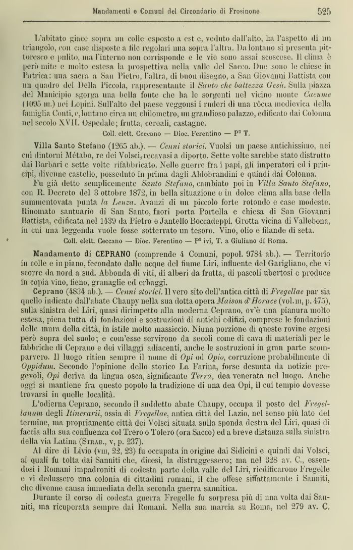 Ceprano (4834 ab,). — Cenni storici. Il vero sito dell'antica città di Fregellae par sia quello indicato dall'abate Cliaupy nella sua dotta opera Maison d'Borace (voi.ni, p. 475), sulla sinistra del Liri, quasi dirimpetto alla moderna Ceprano, ov'è una pianura molto estesa, piena tutta di fondazioni e sostruzioni di antichi edifizi, comprese le fondazioni delle mura della città, in istile molto massiccio. Niuna porzione di queste rovine ergesi però sopra del suolo; e com'esse servirono da secoli come di cava di materiali perle fabbriche di Coprano e dei villaggi adiacenti, anche le sostruzioni in gran parte scomparvero. 11 luogo rititili sempre il nome di Opi od Opio, corruzione, probabilmente di Oppidim. Secondo l'opinione dello storico La Farina, forse desunta da notizie pregevoli. Opi deriva da lingua osca, significante Terra, dea venerata nel luogo. Anche oggi si mantiene fra questo popolo la tradizione di una dea Opi, il cui tempio dovesse trovarsi in quelle località.