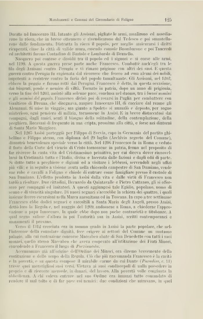 Nel 120Ò Ai-si-i parteggiò per Filippo di Svevia, capo in Germania del partito ghibellino e Filippo stesso, con diploma del 29 luglio (Archivio segreto del Connine), dimostrò benevolenza speciale verso la città. Nel 120G Francesco fu in Roma e veduto il fasto della Corte del vicario di Cristo tornossene in patria, fermo nel proposito ili far ,iv ivere la casta vita del Cristianesimo primitive, per cui diceva dover l'innovellarsi la Cristianità tutta e 1 Italia, divisa e lacerata dalle fazioni e dagli odii di parte. Si dette tutto a preghiere e digiuni ed a visitare i lebbrosi, servendoli negli uthzi più vìi e in seguito a visione avuta nella chiesuola campestre di San Damiano, vende sue robe e cavalli a Foligno e chiede di entrare come famigliare presso :1 custode di >an Dannano. L'effetto prodotto in Assisi dalla vita e dalle virtù di Francesco non tardò a risultare. Due cittadini, Bernardo da Qnintavalle e Pietro Cattaneo, gli si offersero per compagni ed imitatori. \ questi aggi unge si tale Egidio, popolano, uomo di senno e di vivacità singolare. Di nuovi seguaci s'accrebbe la schiera dei quattro, i quali insieme fecero escursioni nella Marca anconitana ed in Toscana. In capo a tre settimane Francesco ebbe dodici segnaci e raccoltili a Santa Maria degli Angeli, presso Assisi, dettò loro la Regola e, nel maggio del 1209, andossene a Roma, a chiederne l'approvazione a papa Innocenzo, la (piale ebbe dopo 11011 poche contrarietà e titubanze. A ipial segno salisse d'allora in poi l'autorità sua in Assisi, scritti contemporanei e monumenti il provano.