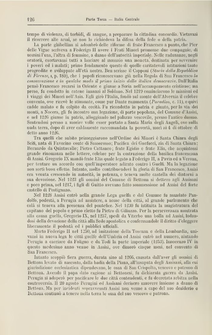 La parte ghibellina si adombrò delle riforme di frate Francesco a punto, che Pier delle Vigne scriveva a Federigo II avere i Frati Minori promosse due compagnie, di uomini l'una, l'altra di femmine, a danno dell'autorità imperiale. Nelle radunanze, negli oratorii, esortavansi tutti a lasciare al massaio una moneta, destinata per sovvenire t poveri ed i inalati; primo fondamento questo di quelle caritatevoli istituzioni tanto progredite e sviluppate all'età nostra. Ben scrisse il Capponi (Storia della Repubblica di Firenze, i, p. 180), che i popoli riconoscevano già nella Pegola di San Francesco la conseci'azione e in qualche modo il primo inizio della itidìca democrazia. Dall'Italia pensò Francesco recarsi in Oriente e giunse a Soria nel l'acca) ripa mei ito cristiano; ina preso, fu condotto in catene innanzi al Sohlauo. Nel 1219 cominciarono le missioni ed i viaggi dei Minori nell'Asia. Egli girò l'Italia, fondò sul monte delPÀlvemia il celebre convento, ove ricevè le stimmate, come pur Dante rammenta (Paradiso, c. 11), e quivi cadde malato e fu colpito da cecità. Fu ricondotto in patria e giunto, per la via dei monti, a Nocera, gli fu incontro una legazione, di parte popolana, del Comune d'Assisi, e nel 1220 giunse in patria, alloggiando nel palazzo vescovile, presso l'antico duomo. Sentendosi presso a morire volle esser portato a Santa Maria degli Angeli, ove sulla nuda terra, dopo di aver caldamente raccomandata la povertà, morì ai 4 di ottobre di detto anno 1226.