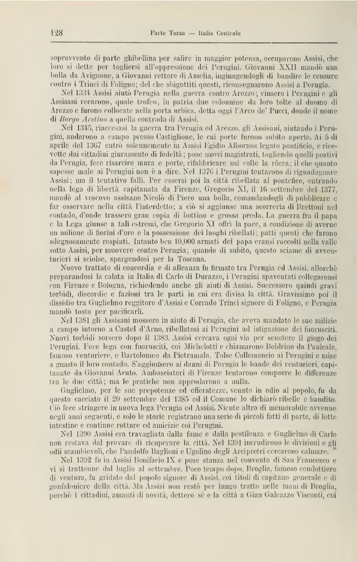 Nel 1345, riaccesasi la guerra tra Perugia ed Arezzo, gii Assisaui, aiutando i Perugini, andarono a campo presso Castiglione, le cui porte furono subito aperte. Ai 5 di aprile del 13G7 entrò solennemente in Assisi Kgidio Alboino?, legato pontificio, e ricevette dai cittadini giuramento di fedeltà; pose nuovi magistrati, togliendo quelli postivi da Perugia, fece risarcire mura e porte, rifabbricare sul colle la ròcca; il che quanto sapesse male ai Perugini non è a dire. Nel 137G i Perugini tentarono ili riguadagnare Assisi; ma il tentativo falli. Per essersi poi la città ribellata al pontefice, entrando nella lega di libertà capitanata da Firenze, Gregorio XI, il Iti settembre del 1377, mandò al vescovo assisane» Nicolò di Piero una bolla, comandandogli di pubblicare e far osservare nella città 1 interdetto; a ciò si aggiunse una scorreria di Brettoni nel contado, d'onde trassero gran copia di bottino e grossa preda. La guerra fra il papa e la Lega giunse a tali estremi, che Gregorio XI offri la pace, a condizione dì averne un milione di fiorini d'oro e la possessione dei luoghi ribellati; patti questi che furono sdegnosamente respinti. Intanto ben 10,000 armati del papa eransi raccolti nella valle sotto Assisi, per muovere contro Perugia; quando di subito, questo sciame di avventurieri si sciolse, spargendosi per la Toscana.