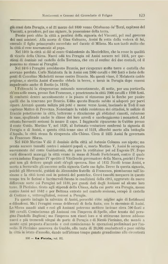 Nel 1430 Martino Y die il dominio della città ad Antonio Colonna suo nipote; ma preste sorsero tumulti contro i ministri papali e, morto Martino Y, Assisi fu occupata nuovamente dal conte Guidantonio, che pare la restituisse poi ad Eugenio IV. Dopo vani disonesti maneggi la città venne in mano di Nicolò Fortebracci, contro il quale aveva indarno Eugenio IV spedito il Vitelleschi governatore della Marca, poiché i Perugini non gli dettero quegli aiuti ch'egli sperava. Sino al 1435 Nicolò tenne Assisi, e morto a Serra valle gli successe nella signoria Carlo suo figlio. Breve fu questa signoria, poiché gli Sforzeschi, guidati da Alessandro fratello di Francesco, piombarono sull'As-sisano e la città tornò cosi in potestà del pontefice. Gravi tumulti nacquero iu questo tempo tra le fazioni e lacrimevoli furono le condizioni della città, aggravate da nuove differenze sorte coi Perugini nel 141-0, per guasti dati dagli Assisani ad alcune loro terre. Il Piccinino, tirato agli stipendi della Chiesa, dalla cui parte era Perugia, mosso contro Assisi nel 1142 e per Bettona entrato nel contado assisane, occupò il castello di Costano e, vettovagliatosi, recossi a Perugia.