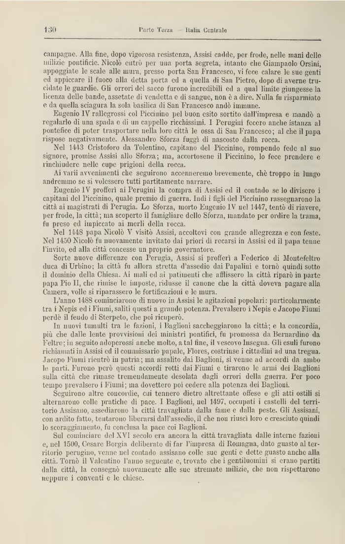 campagne. Alla fine, dopo vigorosa resistenza, Assisi cadde, per frode, nelle mani delle milizie pontificie. Nicolò entrò per una porta segreta, intanto che Giampaolo Orsini, appoggiate le scale alle mura, presso porta San Francesco, vi fece calare le sue genti ed appiccare il fuoco alla detta porta ed a quella di San Pietro, dopo di averne trucidate le guardie. Gli orrori del sacco furono incredibili ed a qual limite giungesse la licenza delle bande, assetate di vendetta e di sangue, non è a dire. Nulla fu risparmiato e da quella sciagura la sola basilica di San Francesco andò immiine.