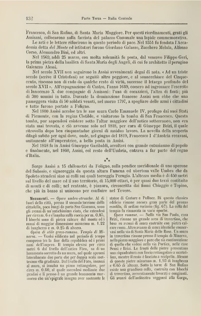 Opere romane. — Nella \ia San Paolo, casa Brizi, rimane un grande arco di travertino, che basa su avanzi di mura costruite con pietra cai care rossa. Altro avanzo di mura identiche conservasi nella via di Santa Maria delle Rose. Un muro in travertino rimane presso il tempio di Minerva, nella piazza maggiore e pare che sia continuazione di quello che vedesi nella via l'ortica, nelle case Sensi e Brizi. Le fronti delle pietre presentano una ì iquadratura con fascia rettangolare a martellina, mentre il resto è lasciato a scalpello. Alcune di queste pietre misurano ffl, 1.93 di lunghezza e 0.05 di altezza. Sotto la torre di San Rufino esiste una grandiosa cella, costruita con blocchi di travertino, accuratamente lavorati e congiunti. Gli avanzi dell'anfiteatro veggonsi alla Gorga,