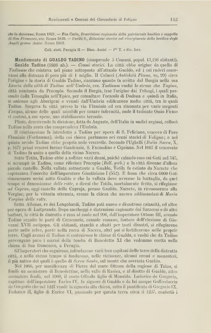 Gualdo Tadino (8S0S ab.). — Cernii storici. La città ebbe origine da quella di Tadimtm che esisteva nel piano sottoposto all'attuale Gualdo, ed i cui rad eri osservici alla distanza di poco più di 1 miglio. 11 Colucci (Antichità Picene, vn, 99) circa l'origine e la storia di Gualdo Tadino, riassume quanto fu scritto dal Borgia nella sua Istoria della città di Tadino ncU' Umbria, ecc. Tadimim vuoisi lo stesso che 'Pagina, città nominata da Procopio. Secondo il Borgia, trae l'origine dai Pelasgi, i quali passando dalla Tessaglia nell'Epiro, peli consultare l'oracolo di Dodona e quindi in Italia, si unirono agli Aborigeni e venuti dall'Umbria edificarono molte città, tra le quali Tadino. Sorgeva la città presso la via Flaminia ed era rinomata per varie sorgenti d'acqua, alcune delle quali mirabili per sanare infermità, onde il tadinate Oinm Firmo vi costruì, a sue spese, uno stabilimento termale.