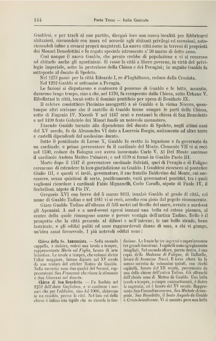 dazione. La fronte ha tre ingressi e superiormente tre grandi lìnestroni. 1 capitelli sono egregiamente intagliati. Nel secondo altare, parete destra, è una copia della Madonna di Foligno, di Raffaello, lavoro di Avanzino Nucci. Il terzo altare Ila la mensa sorretta da colonnine spirali, con ricchi capitelli, lavora del XII secolo, proveniente da una delle chiese dell'antica Tadino. Gli affreschi dell'abside sono di Matteo da Gualdo. Una bella tavola a tempra, a cinque compartimenti, è dietro la sagrestia, ed e lavoro del XV secolo. Rappresenta San Facondino vescovo, San Michele Arcan-giolo, San Benedetto, il bealo Angiolo da Gualdo e Cristo benedicente. Vi si ammira pure una bella
