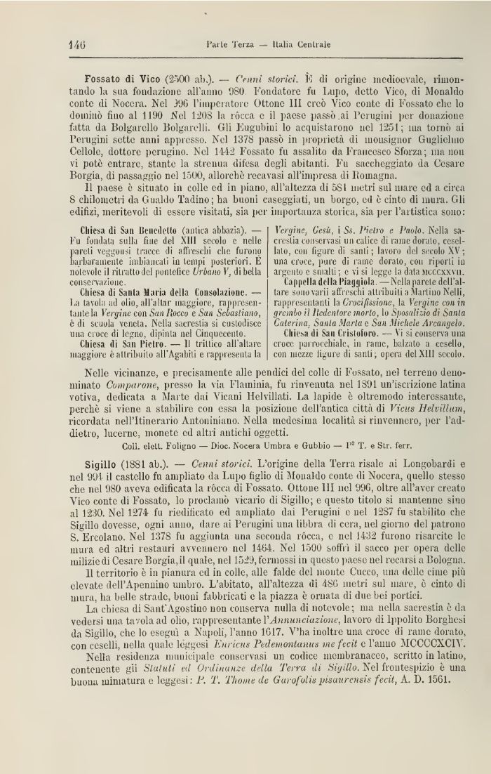 Fossato di Vico (2500 ab,). — Cenni storici. È di origine ìncdiocvale, rimontando la sua fondazione all'anno OSO. Fondatore fu Lupo, detto Vrico, di Monaldo conte di Nocera. Nel 396 l'imperatore Ottone III creò Vico conte di Fossato clic lo dominò lino al 1190 Nel 120S la ròcca e il paese passò ai Perugini per donazione fatta (la Bolgarello Bolgarelli. Gli Eugubini lo acquistarono nel 1251 ; ina tornò ai Perugini sette anni appresso. Nel 1378 passò in proprietà di monsignor Guglielmo Cellule, dottore perugino. Nel 1442 Fossato fu assalito da Francesco Sforza; ma non vi potè entrare, stante la strenua difesa degli abitanti. Fu saccheggiato da Cesare Borgia, di passaggio nel 1500, allorché recavasi all'impresa di Romagna
