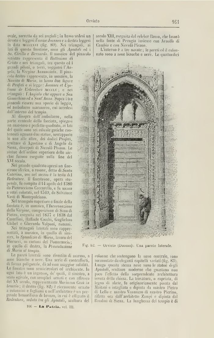 Le pareli laterali sono rivestite di marmo, a zone bianche e nere. Una serie di contrafforti, di forma poligonale, dà ad esse maggior solidità. Le finestre sono semicircolari ed archiacute. In ogni lato e uii ingresso, de' quali, il sinistro, a scilo ogivale, con semplici ornati e con affresco del XV secolo, rappresentante Maria con Gesù in braccio; il desilo (fig. 82; è riccamente ornato a colonnini e fogliami e nell'architrave e uri pregevole bassorilievo di bronzo, in cui è effigiato il Piedenbre, sedato tra gli Apostoli, scultura del