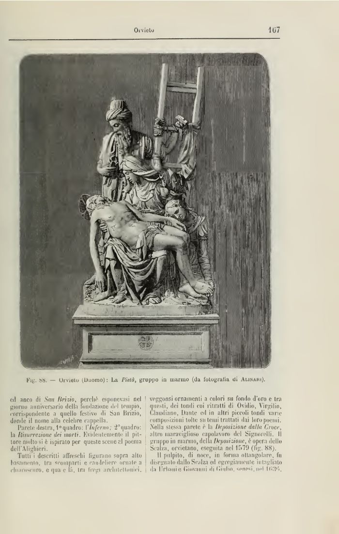 veggonsi ornamenti a colori su fondo d'oro e tra questi, ilei tonili coi ritraili di Ovidio, Virgilio, Glamliario, Dante ed in altri piccoli tondi varie composizioni tolte su lenii trattati dai loro poemi. Nella stessa parete è la Deposizione dalla Croce, altro maraviglioso capolavoro del Signorelli. Il gruppo in marmo, della Deposizione, è opera dello Scalza, orvietano, eseguita nel 1T>70 (fig. 88).