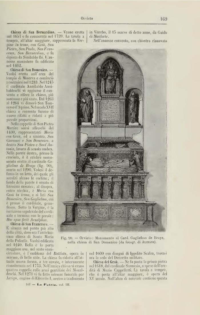 Nella cappella di San Pietro Martire sonvi affreschi del 1130, rappresentanti Maria con Gesù, ed a sinistra, San ti io cu uni e San Domenico, a destra San Pietro e Sant'Antonio, lavoro di scuola umbra. Nella parete destra, presso la crociera, è il celebre monumento eretto al cardinale Guglielmo de Braye (fig. 90), morto nel 1290. Vedcsi il defunto in un letto, del quale gli accoliti alzano le cortine ; il fondo della parete è ornato di finissimi mosaici; al disopra, entro nicchia, è Maria con Gesù in trono, e ai lati San Domenico, San Guglielmo, cui è presso il cardinale, genuflesso. Sotto la Vergine, è la iscrizione sepolcrale del cardinale c termina con le parole : lloc opus fecit Arnolphus.