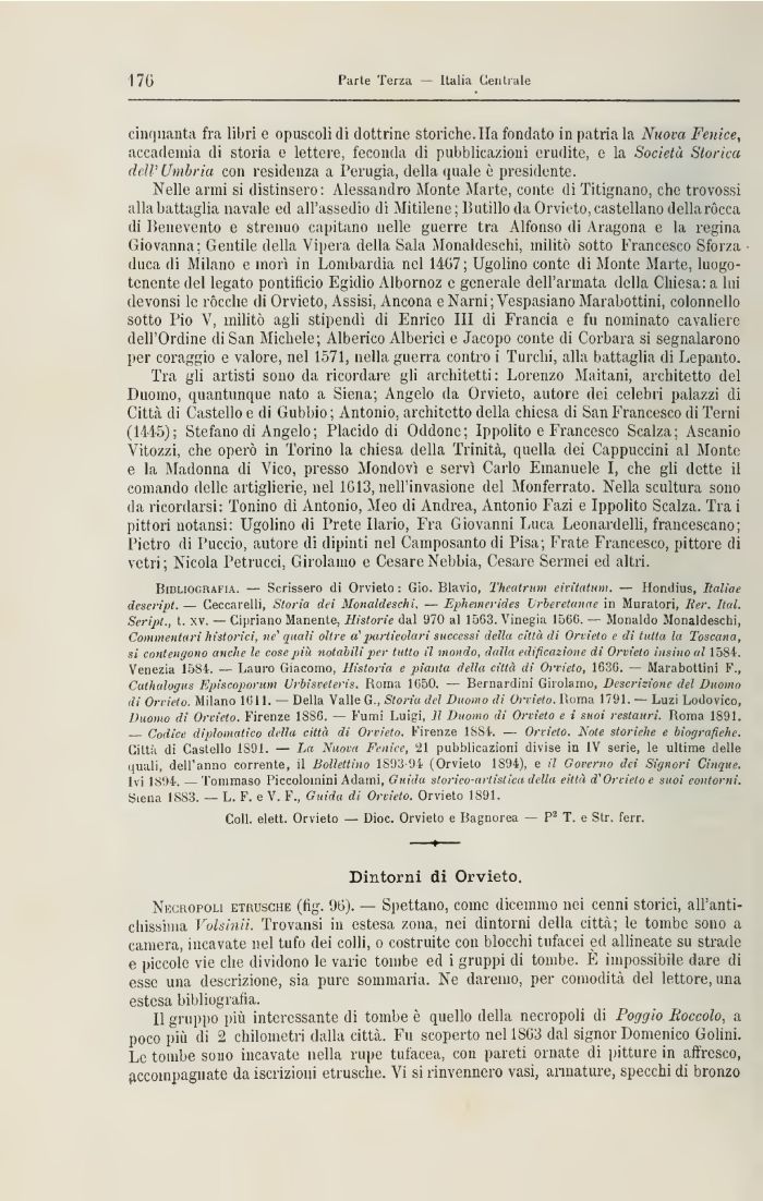 Bibliografia. — Scrissero di Orvieto : Gio. Blavio, Theatrum eivitatum. — Hondius, Italìae descript. — Ceccarelii, Storia dei Monaldeschi, — Epheinerides Vrberetanae in Muratori, Iter. Ital. Script., t. xv. — Cipriano Manente, Historie dal 970 al 1563. Vinegia 1560. — Monaldo Monaldeschi, Commentari historici, ne' quali oltre a'particolari successi della città di Orvieto e di tutta la Toscana, si contengono anche le cose più notabili per tutto il mondo, dalla edificazione di Orvieto insinoal 1584. Venezia 1584. — Lauro Giacomo, Historia e pianta della città di Orvieto, 163G. — Marabottini F., Cuthalogus Episcoporum Urbisveteris. Roma 1 <550. — Bernardini Girolamo, Descrizione del Duomo di Orvieto. Milano 1(511. — Della Valle G., Storiu del Duomo di Orvieto. Roma 1791. — Luzi Lodovico, Duomo di Orvieto. Firenze 1886. — Fumi Luigi, Il Duomo di Orvieto e i suoi restauri. Roma 1891. — Codice diplomatico dilla città di Orvieto. Firenze ISSt. — Orvieto. Note storiche e biografiche. Città di Castello 1S91. — La Nuova Fenice, L21 pubblicazioni divise in IV serie, le ultime delle quali, dell'anno corrente, il Bollettino 1893-94 (Orvieto 1894), e il Governo dei Signori Cinque. Ivi 1894. — Tommaso Piccolominì Adami, Guida storico-artistica della città d'Orvieto e suoi contorni. Siena 1S83. — L. F. e V. F., Guida di Orvieto. Orvieto 1891.