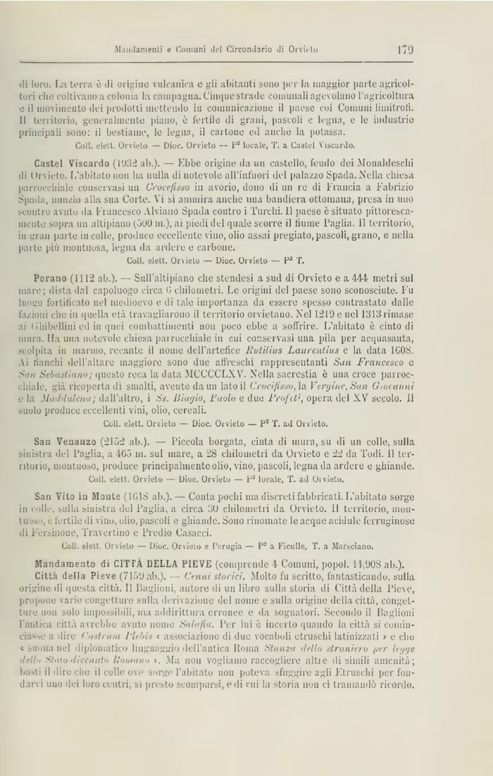 Castel Viscardo (l*J32 ab.). — Ebbe origine da un castello, feudo dei Monaldeschi di Orvieto. L'abitato non ha nulla di notevole all'infuori del palazzo Spada. Nella chiesa parrocchiale conservati uu Croce/isso in avorio, dono di un re di 1 lancia a Fabrizio Spaila, nunzio alla sua Corte. \ t si ammira anche una bandiera ottomana, presa in uno scontro avuto da Francesco Alviauo Spada contro i Turchi. 11 paese è situato pittorescamente sopra un altipiano (500 ni.), ai piedi del quale scorre il fiume Taglia. 11 territorio, in man parte in colle, produce eccellente vino, olio assai pregiato,pascoli, grano, e nella parte più montuosa, legna da ardere e carbone.