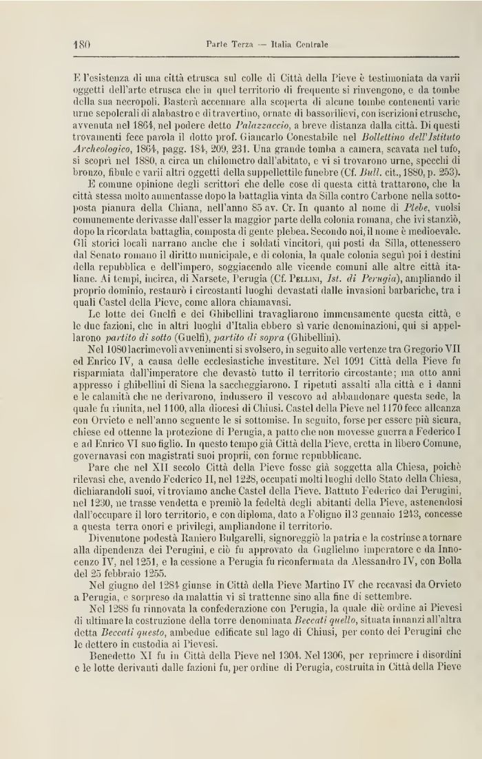 E l'esistenza di una città etnisca sul colle di Città della I'ieve è testimoniata da varii oggetti dell'arte etnisca che in quel territorio di frequente si rinvengono, e da tombe della sua necropoli. Pastora accennare alla scoperta di alcune tombe contenenti varie urne sepolcrali di alabastro e di travertino, ornate «li bassorilievi, con iscrizioni etrusche, avvenuta nel 1864, nel podere detto Palazzaccio, a breve distanza dalla città. I)i questi travamenti fece parola il dotto prof. Giancarlo Gonestabile nel Bollettino dell'Istituto Arpheologico, 1864, pagg. 184, 209, 231. Una grande tomba a camera, scavata nel tufo, si scopri nel 1880, a circa un chilometro dall'abitato, e vi si trovarono urne, specchi di bronzo, fibule e varii altri oggetti della suppellettile funebre (Cf. Bull, cit., 1880, p. 253).