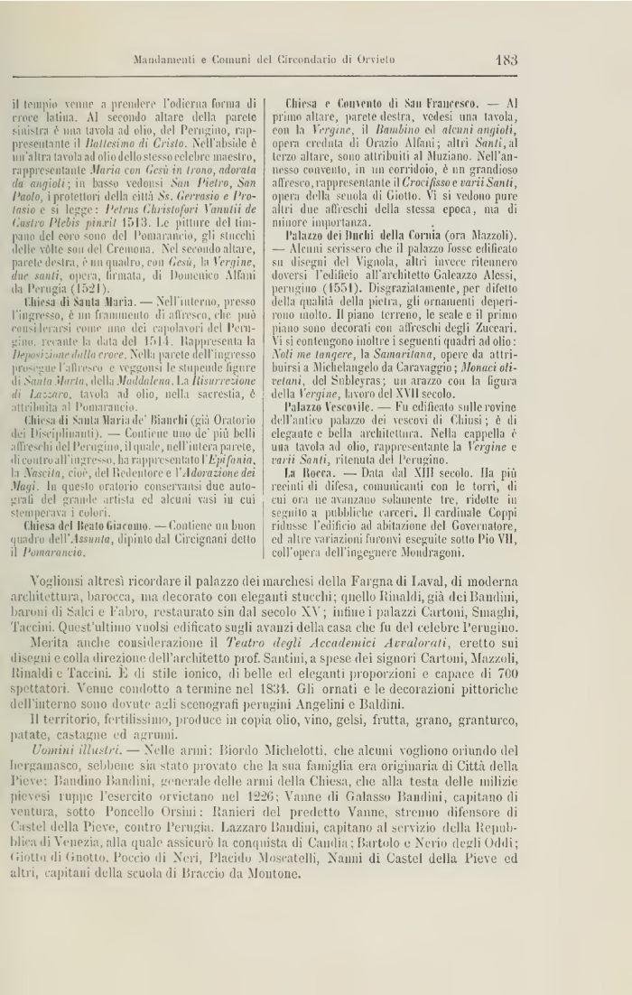 Uomini illustri. — Nelle grini: Biordo Michelotti. che alcuni vogliono oriundo del bergamasco, sebbene sia stato provato che la sua famiglia era originaria di Città della Pieve; Randino Bandini, generale delle armi della Chiesa, che alla testa delle milizie pievesi ruppe l'esercito orvietano nel li'20; Vanne ili Galasso Bandini, capitano di ventura, sotto Poncello Orsini : Ranieri del predetto Vanne, strenuo difensore di Castel della Pieve, contro Perugia. Lazzaro Bandini, capitano al servìzio della Repnll blica di Venezia, alla quale assicurò la conquista di Camlia ; Bartolo e Nerio degli Oddi ; Hiottu di Gnotto, Poccio ili N'eri, Placido Moscatelli, Nanni di Castel della Pieve ed altri, capitani della scuola di Braccio da Montone.