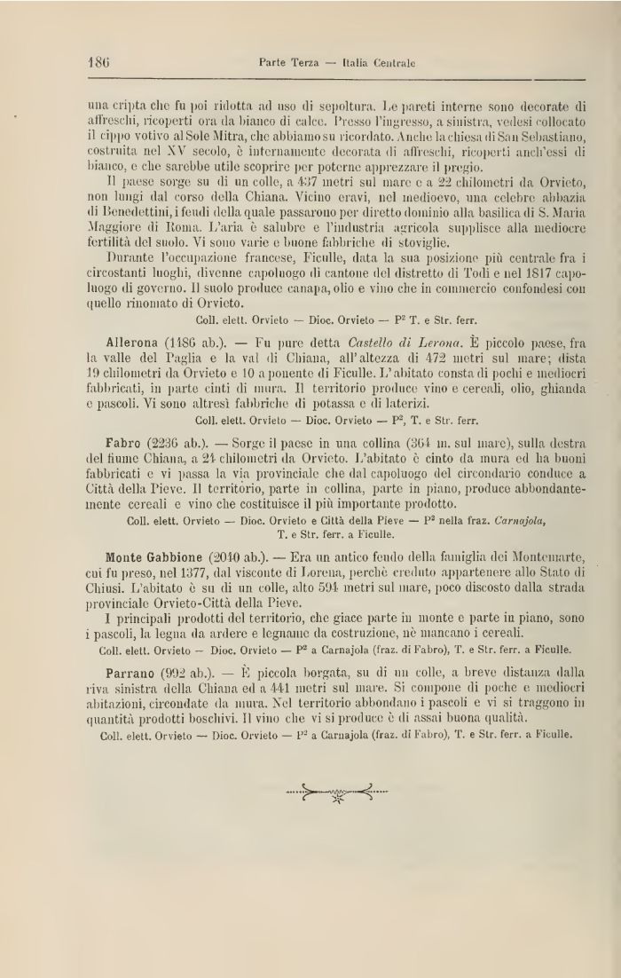 Fabro (2236 ab.). — Sorge il paese in una collina (304 m. sul mare), sulla destra del fiume Chiana, a 21 chilometri ila Orvieto. L'abitato e cinto da mura ed ha buoni fabbricati e vi passa la via provinciale che dal capoluogo del circondario conduce a Città della Pieve. Il territorio, parte in collina, parte in piano, produco abbondante-niente cereali e vino che costituisce il più importante prodotto.