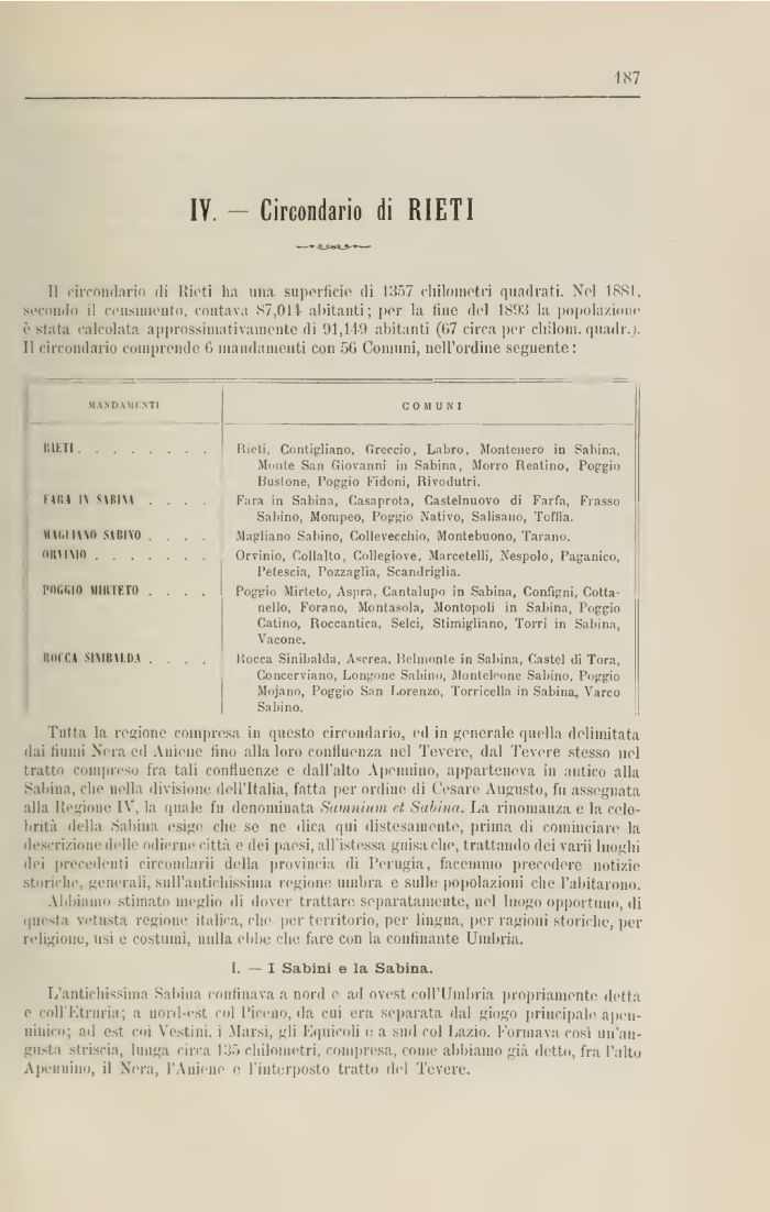 Tutta la regione compresa in questo circondario, ed in generale quella delimitata dai fiumi Nera ed Viiiene fino alla loro confluenza nel Tevere, dal Tevere stesso nel tratto compreso fra tali confluenze e dall'alto \perniino, apparteneva in antico alla Sabina, che nella divisione dell'Italia, fatta per ordine di Cesare Augusto, fu assegnata alla Regione IV, la quale fu denominata Samnium et Sabina. La rinomanza e la celebrità della .Sabina esigi che se ne dica qui distesamente, prima di cominciare la descrizione ili Ile odierne città e dei paesi, allistessa guisa che, trattando dei vani luoghi dei precedènti circondarli della provincia di Perugia, facemmo precedere notizie storiche, generali, siill'antichissima regione umbra e sulle popolazioni che l'abitarono.