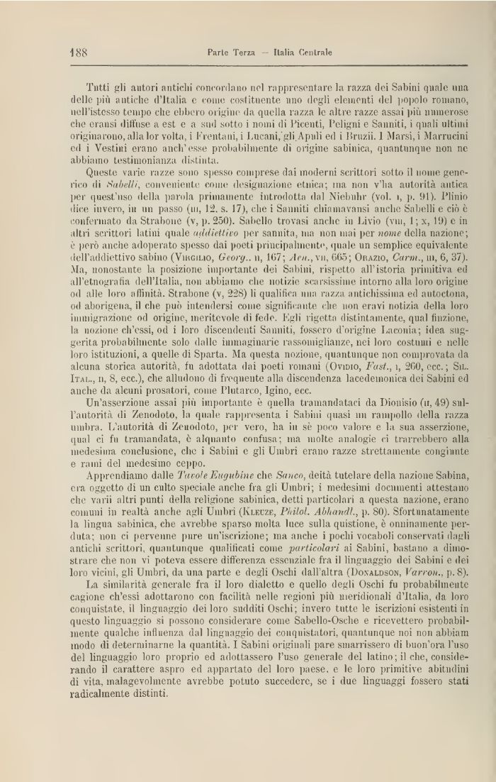 Tutti gli autori antichi concordano noi rappresentare la razza dei Sabini quale una delle più antiche d'Italia e come costituente uno degli elementi del popolo romano, neiristesso tempo ciré ebbero origine da quella razza le altre razze assai più numerose che oratisi diffuse a est e a sud sotto i nomi di Picenti, l'eligni e Sanniti, i quali ultimi originarono, alla lor volta i Krentaiii, 1 Lucani, gli.Apuli ed i lìruzii. I Marsi,i Marrucini ed i Vestiui erano anch'esse probabilmente di origine sabinica, quantunque non ne abbiamo testimonianza distinta.