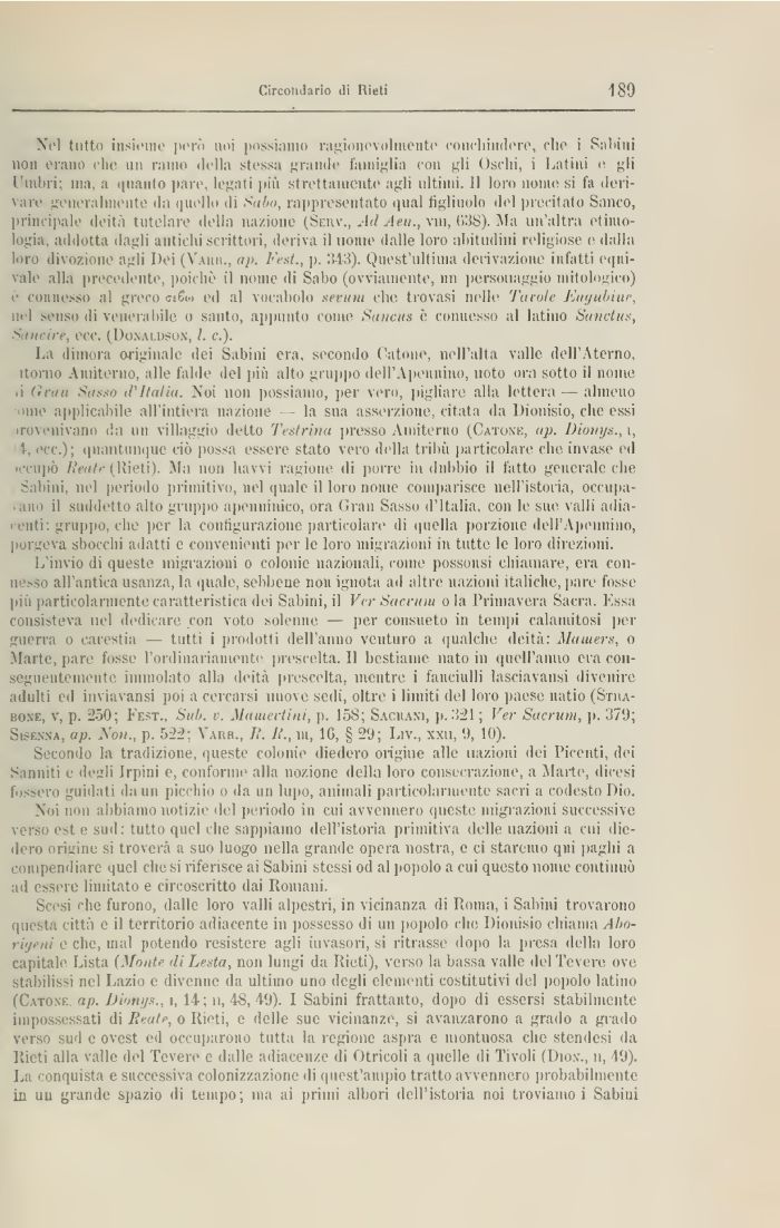 Scesi rhe furono, dalle loro valli alpestri, in vicinanza di Roma, i Sabini trovarono questa città e il territorio adiacente in possesso di un popolo (die Dionisio chiama Aborigeni e che, inai potendo resistere agli invasori, sì ritrasse dopo la presa della loro capitale Lista (Monte di Lesta, non lungi da Rieti), verso la bassa valle delTevere ove stabilissi nel Lazio e divenne da ultimo uno degli elementi costitutivi del popolo latino (Catone, ap. Diutufs., 1, 14; 11, 4S, 4'J). I Sabini frattanto, dopo di essersi stabilmente impossessati di Reale, 0 Rieti, e delle sue vicinanze, si avanzarono a grado a grado verso sud e ovest ed occuparono tutta la regione aspra e montuosa che sten desi da Rieti alla valle del Tevere e dalle adiacenze di Otricoli a quelle di Tivoli (Diox., 11, 4'J). La conquista e successiva colonizzazione di quest'ampio tratto avvennero probabilmente in un grande spazio di tempo; ina ai primi albori dell'istoria noi troviamo 1 Sabini