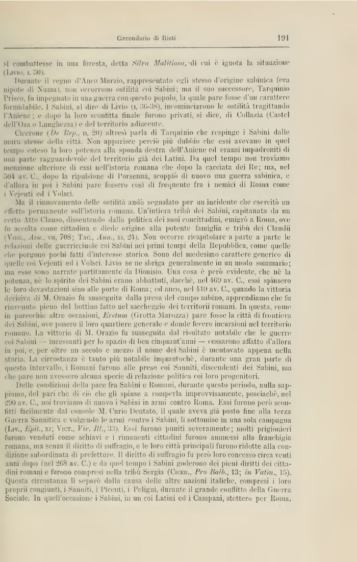 Cuerone (i)e lìep., ti, 20) altresì parla di Tarquinio che respinge i Sabini dalle mura stesse della città. Non apparisce perciò più dubbio che essi avevano in quel temilo esteso la loro potenza alla sponda destra dell'\niene ed entrisi impadroniti di una parte ragguardevole del territorio già dei Latini. Da quel tempo non troviamo menzione ulteriore di essi nell'istoria romana che dopo la cacciata dei Re; ma, nel .>(J4 av. C.. dopo la ripulsione di l'orsenna, scoppiò di nuovo una guerra sabinicaj e d allora iti poi i Sabini pare fossero cosi di frequente fra t nemici di Poma come i Vejenti ed ì Yolsci.