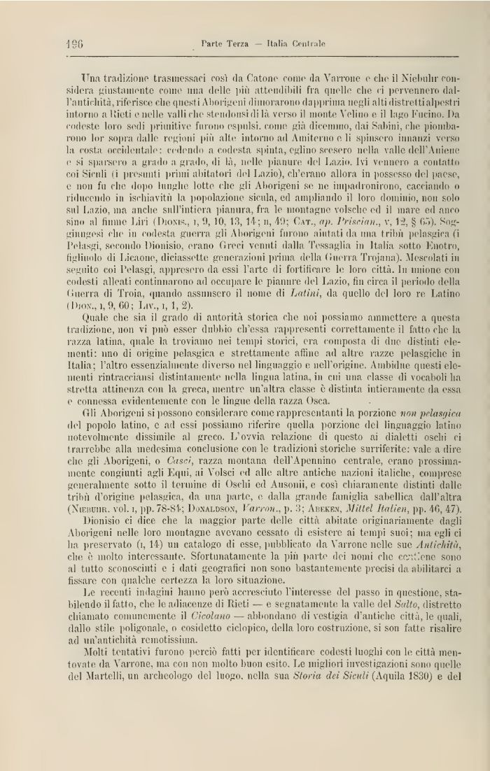 (ili Aborigeni si possono considerare come rappresentanti la porzione non pelasyìca del popolo latino, e ad essi possiamo riferire quella porzione del linguaggio latino notevolmente dissimile al greco. L'ovvia relazione di questo ai dialetti osclii ci trarrebbe alla (medesima conclusione con le tradizioni storiche surriferite: vale a dire che gli Aborìgeni, o CasM razza montana deirApennmo centrale, erano prossimamente congiunti agli Equi, ai Volici ed alle altre antiche nazioni italiche, compose generalmente sotto il termine di Osclii ed Àusonii, e così chiaramente distinti dalle tritai d'origine pelasgica, da una parte, e dalla grande famiglia salicilica dall'altra (xiehuiir. voi. i, pp. 78-81-; Donaldson, Varron., p. 3; Abeke.v, Mittel Italien, pp. 4f5, 47).
