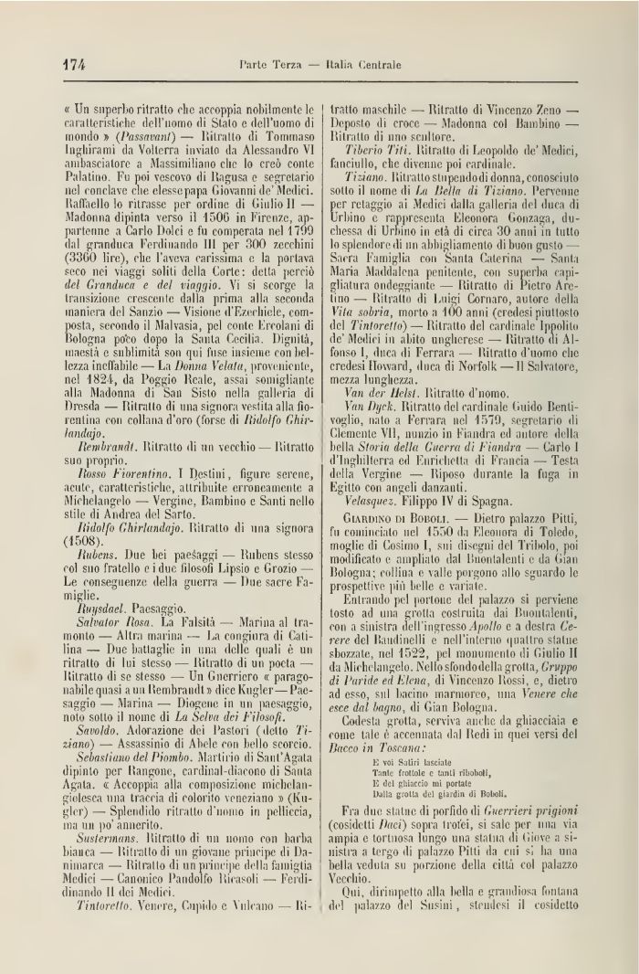 « Un superbo ritratto clic accoppia nobilmente le I caratteristiehe dell'uomo di Stato e dell'uomo di inondo i> (Pasmvan/) — Ritratto di Tommaso In gli ira mi da Volterra inviato da Alessandro VI ambasciatore a Massimiliano che lo creò conte Palatino. Fn poi vescovo di Ragusa e segretario nel conclave che elesse papa Giovanni de' Medici Itaffaello lo ritrasse per ordine, di Giulio li — Madonna dipinta verso il 1506 in Firenze, appartenne a Carlo Dolci e fu comperata nel 1100 dal grandu® Ferdinando III per 300 zecchini (3380 lire), clic l'aveva carissima e. la portava seco nei viaggi soliti della Corte: detta perciò del Granduca e del viaggio. Vi si scorge la transizione crescente dalla prima alla seconda maniera del Sanzio —Visione d'Ezechiele, composta, secondo il Malvasia, pel conte Ereolani di Bologna po'eo dopo la Santa Cecilia. Dignità, maestà e sublimità son qui fuse insieme con bellezza ineffabile — La Donna Velata, proveniente, nel 1824, da Poggio Reale, assai somigliante alla Madonna di San Sisto nella galleria di Dresda — Ritratto di una signora vestita alla lio-rentina con collana d'oro (forse di Ridolfo Ghirlandaio,