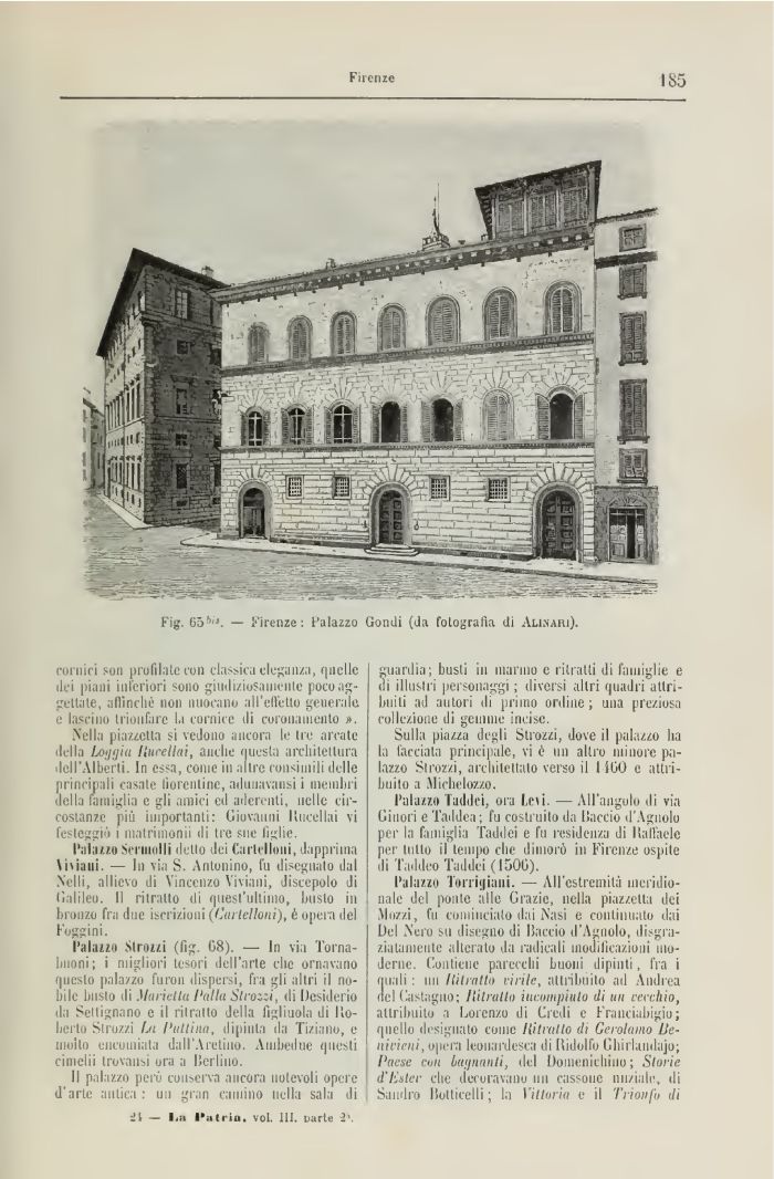 l'alatzn Stroiri (fig. 08). — In via Torna-bnoni; i migliori tesori dell'arte che ornavano questo palazzo furon dispersi, fra gli altri il nobile busto di Muriella Palla Strozzi, di Desiderio da Setlignano e il ritrailo della figliuola di Roberto Strozzi La Pattina, dipinta da Tiziano, e molto encomiata dall'Aretino. Ambedue questi cimelii trovatisi ora a Berlino.