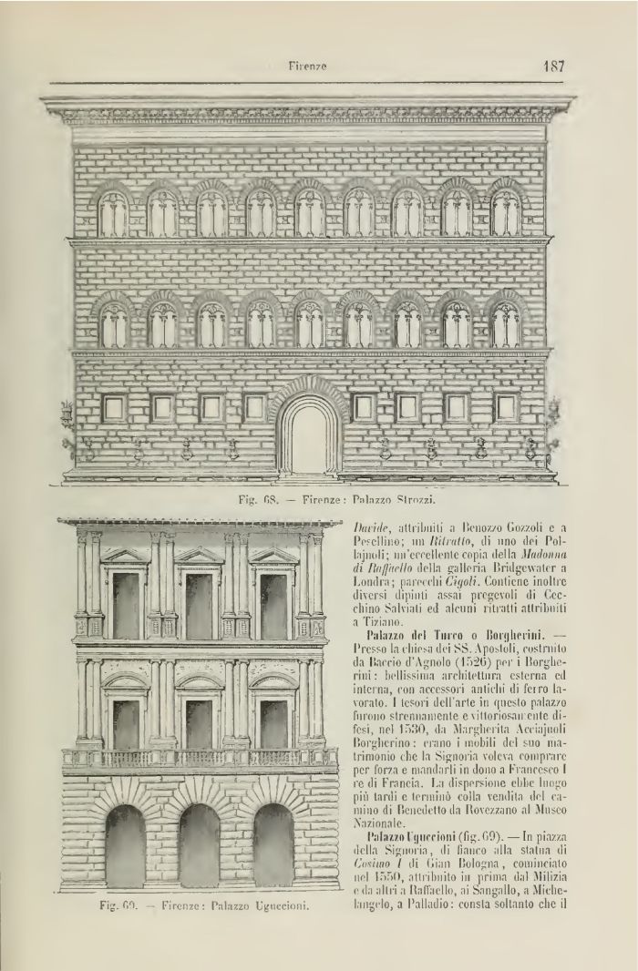 Palazzo I (piccioni (lig. 09). — In piazza della Signoria, di fi auro alla stallia di Cosimo I di Gian Bologna, cominciato nel 131)0, attribuito iu prima dal Milizia e da altri a Raffaello, ai Sangallo, a Michelangelo, a Palladio: consla soltanto che il
