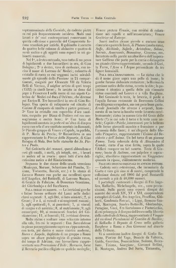 Del Ganimede la tcsla, le braccia, il piede e l'aquila furono restaurale da Benvenuto Celimi con diligenza scrupolosa, ma con poco buon gusto. Fecole fanciullo che strozza i serpenti, frammento di un torso in basalto verde lavoralo eccel-leiilcinente; stallia in marino tiriodel Genio della Morie (?) in cui solo il torso e la testa sono antichi; Cupido epsiclm^ interessanti per la bellezza delle forme giovanili maschie e femminee e per l'armonia delle lince; è un'allegoria della filosofia Pitagorica, rappresentante VUnione del Desiderio e dell'Anima. Ibi bel torso di un giovane Fanno. Testa colossale detta ili Alessandro il Grande, certo d'un eroe forilo, sopra la quale, l'Alfieri compose un bel sonetto. Testa di Giunone; busto di Antimo, con palpebre e sopracciglia; altorilievo rappresentante un )iaggutlore spossato in riposo, evidentemente moderilo.
