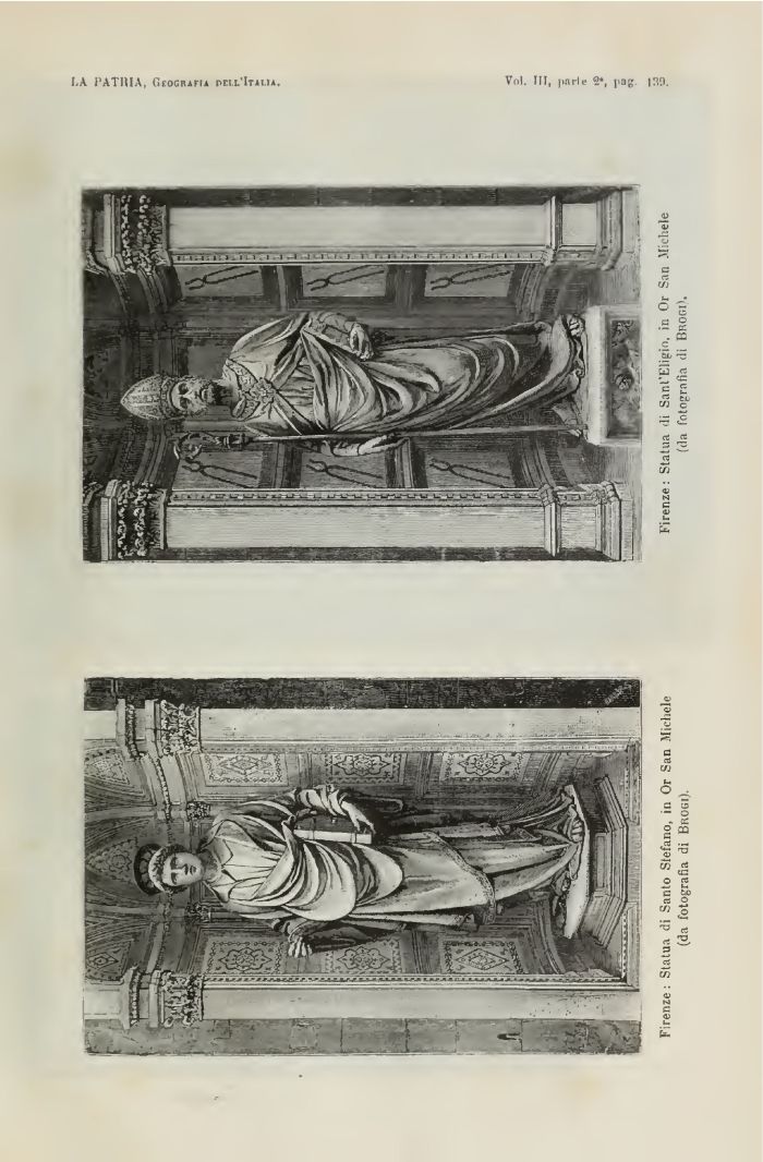 Firenze : Statua di Santo Stefano, in Or San Michele (da fotografia di Brogi). Firenze: Statua di Sant'Eligio, in Or San .Michele (da fotografia di Brogi).