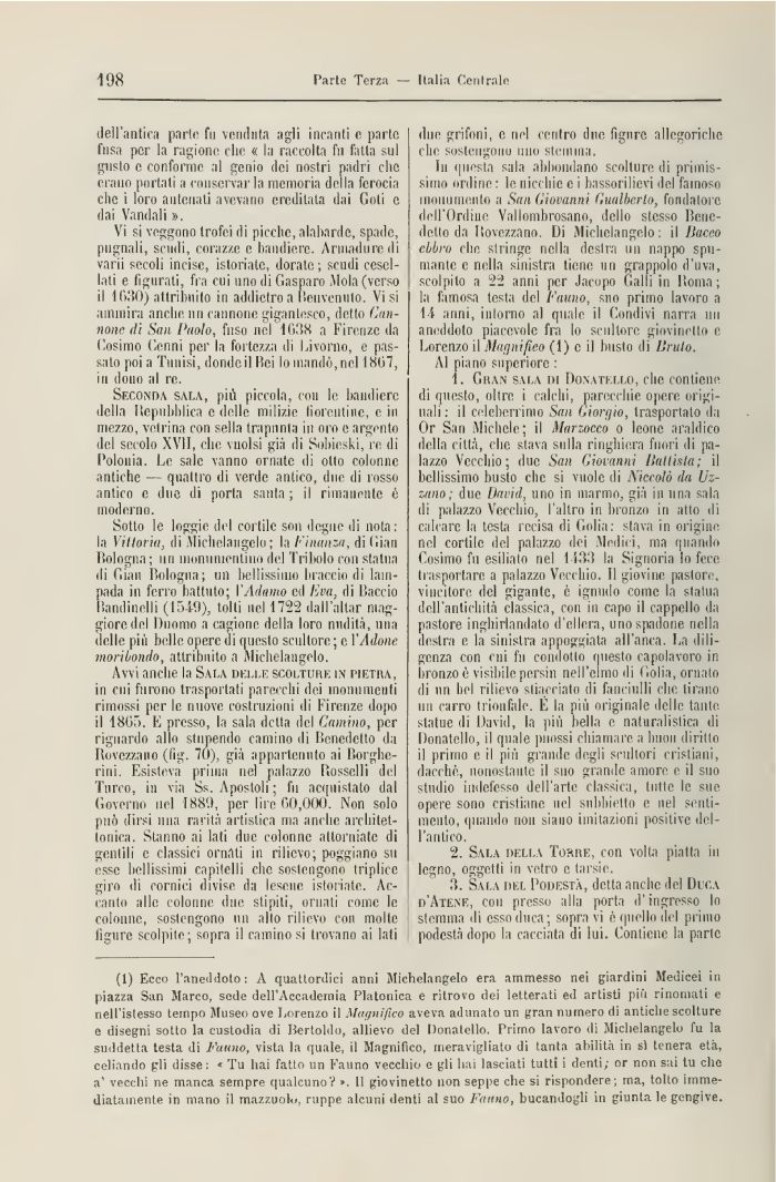 (1) Ecco l'aneddoto: A quattordici anni Michelangelo era ammesso nei giardini Medicei in piazza San Marco, sede dell'Accademia Platonica e ritrovo dei letterati ed artisti più rinomati e ndl'istesso tempo Museo ove Lorenzo il Magnifico aveva adunato un gran numero di antiche Scolture e disegni sotto la custodia di Bertoldo, allievo del Donatello. Primo lavoro di Michelangelo fu la suddetta testa di Fauno, vista la quale, il Magnifico, meravigliato di tanta abilità in sì tenera età, celiando gli disse: « Tu hai fatto un Fauno vecchio e gli bai lasciati tutti i denti; or non sai tu che a' vecchi ne inanca sempre qualcuno? ». 11 giovinetto non seppe die si rispondere; ma, tolto immediatamente in mano il mazzuoli., ruppe alcuni denti al suo Fauno, bucandogli tu giunta le gengive.