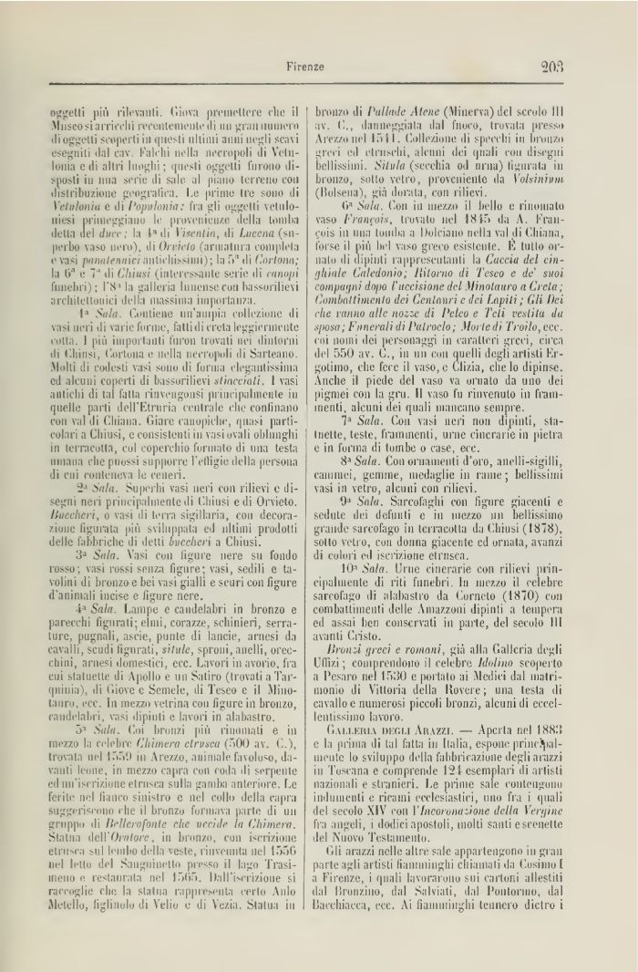 oggetti più rilevanti, (ièna premettere clic il Mnseosiarrifclii recentemente di un gran numero di oggetti scoperti in questi ulti itti anni negli scavi eseguiti dal cav Falchi nella necropoli di Velli-Ionia e di altri luoghi; questi oggetti l'irrori» disposti in mia serie di sale al piano terreno con distribuzione geografica. I.e, prime Ire sono di Vetmlmia e di l'opuhmia: fra gli oggetti vettrlo-niesi priineggiauo le provenienze della tomba detta ilei duce; la laiti Visentin, di Liceità (superbo vaso nero), di Orrido (armatura completa evasi panatennici antieljissiiiiifj la di Eartonn; la (V1 e 7' di Chiusi (interessante serie di canopi funebri); l'S'la galleria Iniiensecon bassorilievi architettonici della massima importanza.