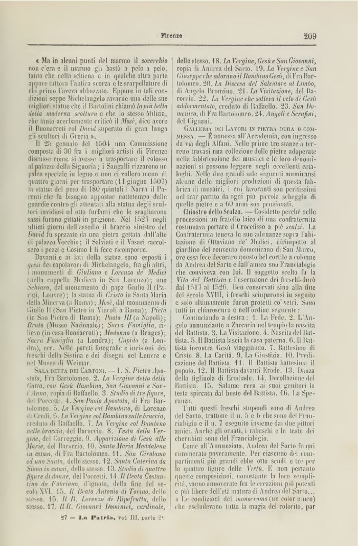 Chiostro dello Scalzo. — Cosidelto perché nelle processioni un fratello laico di una confraternita costumava portare il Crocefisso a piò scalzi. I a Confraternita teneva le sue adunanze sopra l'abitazione di Ottaviano de' Medici, dirimpetto al giardino del convento domenicano di San Marco, ove essa fere decorare questo bel cortile a colonne da Andrea del Sarto e dall'amico suo Fraueiabigio che conviveva con Ini. Il soggetto scelto fu la Vita del Battista e l'esecuzione dei freschi durò dal 1517 al 1526. Ben conservati sino alla fine del secolo XVIII, i freschi sriupannisi in seguito e solo ultimamente furori protetti co'vetri. Sono tutti in chiaroscuro e nell'ordine seguente: