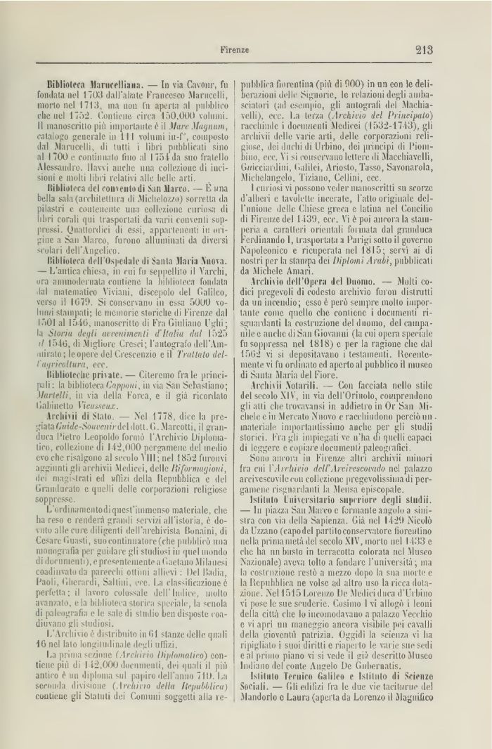 Biblioteca Marucelliaiia. — In via Cavour, fn fondata ne! 1103 dall'abate Francesco .Manicelli, morto ne! 1713, ina non fn aperta al pubblico clic nel 1752. Contiene circa 150,000 volumi. Il manoscritto più importante è il Mare \fuijmm, catalogo generale in 1(1 volumi iu-f', composto dal Manierili, di tutti i libri pubblicati sino al 1700 e continuato tino al 175 fila suo fratello Alessandro, llavvi nuche una collezione di incisioni e molti libri relativi alle belle arti.