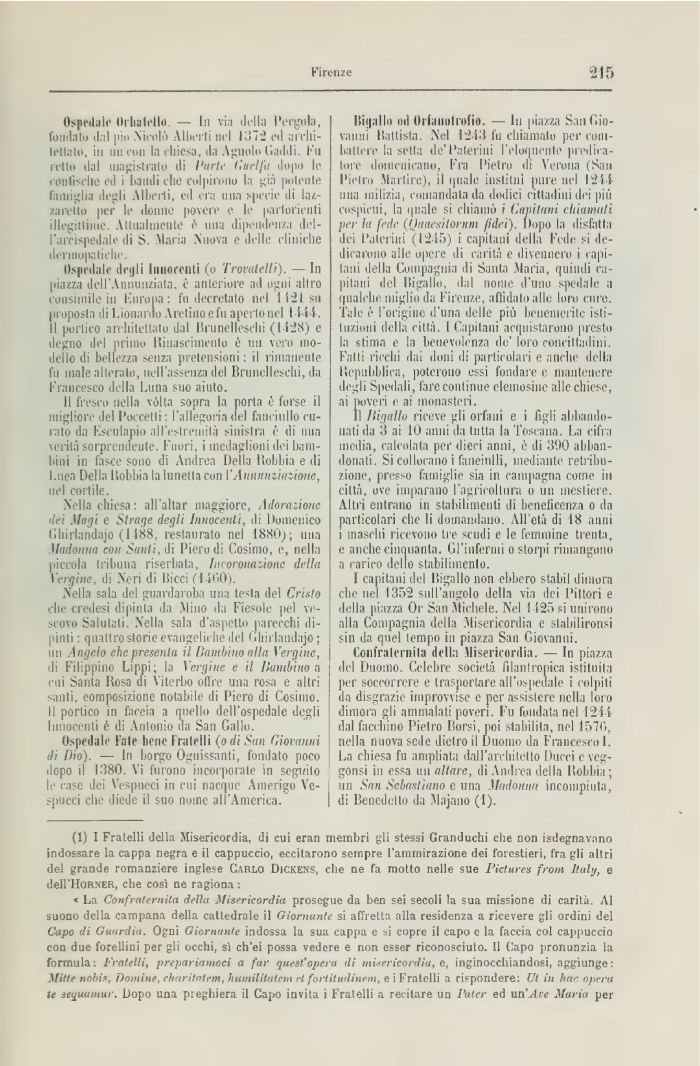 (1) I Fratelli della Misericordia, di cui eran membri gli stessi Granduchi che non Sdegnavano indossare la cappa negra e il cappuccio, eccitarono sempre l'ammirazione dei forestieri, fra gli altri del grande romanziere inglese Carlo Dickens, che ne fa motto nelle sue Fictureu front lluly, e dell'HoRNER, che cosi ne ragiona :