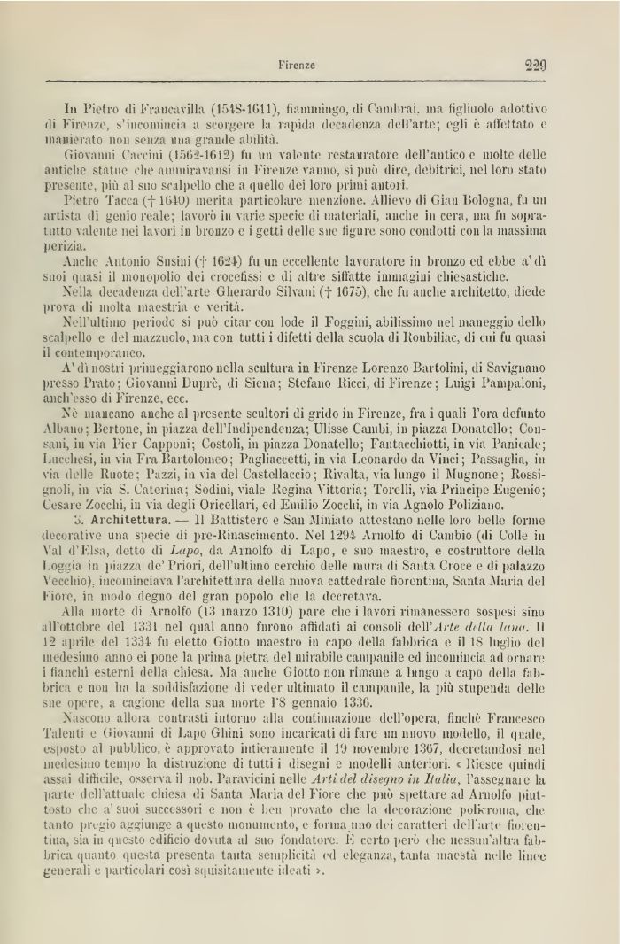 Nò mancano anche al presente scultori di grido in Firenze, fra 1 quali l'ora defunto Albano; Bertone, in piazza dell'Indipendenza; Ulisse Cambi, in piazza Donatello: Causami, invia Pier Capponi; Costoli, iu piazza Donatello; Fantacchiotti, in via Panicale; Lucchesi, iu via Fra Bartolomeo; Pagliaccetti, in via Leonardo da Vinci ; Passa gli a, in via delle Ruote; Pazzi, iu via del Castellacelo ; Ilivalta, via lungo il Mugnone; Itossi-gnoli, in via S. Caterina; Sodini. viale Regina Vittoria; Torelli, via Principe Eugenio; Cesare Zoccln, in via degli Oricellari, ed Emilio Zocchi, in via Agnolo Poliziano.