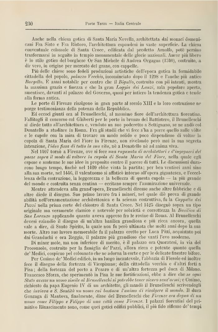 Ed eccoci giunti ora al Rrunelleschi, al massimo fiore dell'architettura fiorentina. Fallitogli d concorso col Ghiberti per le porte in bronzo del Battistero, il Brunelleschi si diede tutto all'architettura e, venduto un suo poderetto a Settignano, se ne andò col Donatello a studiare in Roma. Fra gli studii che vi fece s'ha a porre quello sulle vòlte e le cupole con la mira di trovare un modo solido e poco dispendioso di voltar hi cupola di Santa Maria del Fiore ili Firenze, non rivelando però inai la sua segreta intenzione, Videa fissa di tutta la sua vita, ne a Donatello uè ad anima viva.
