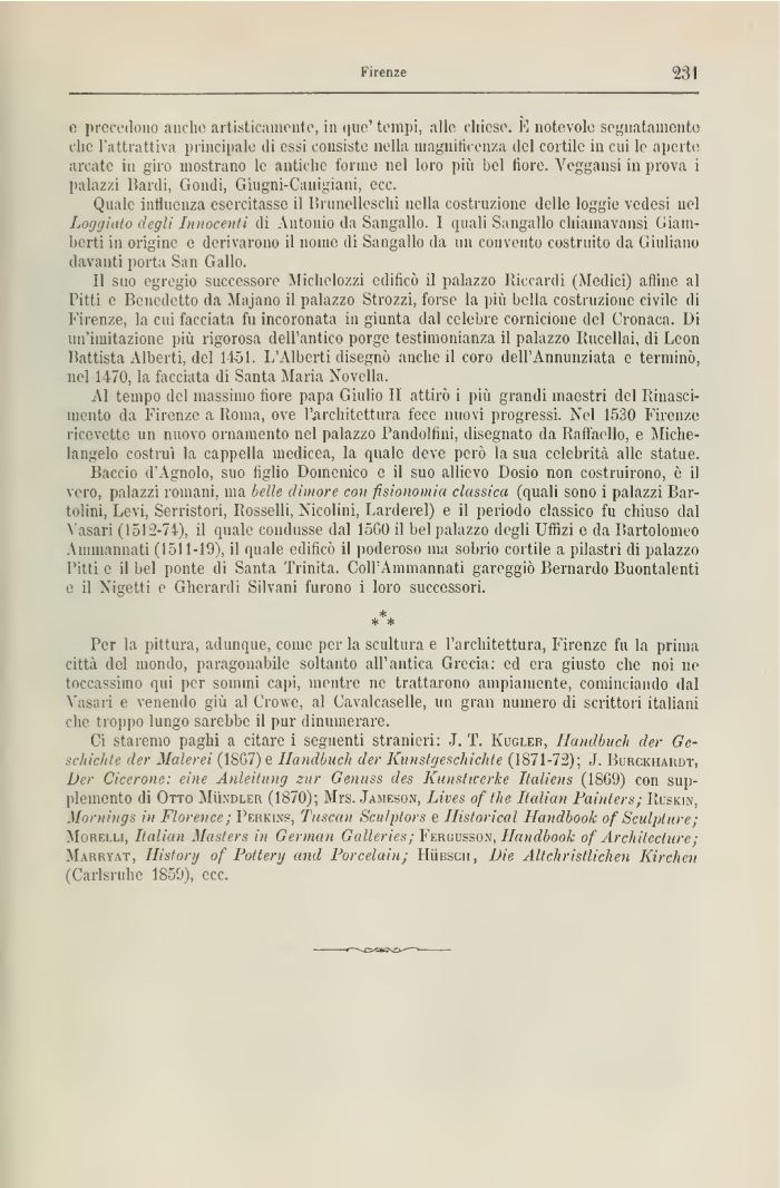 Ci staremo paghi a citare i seguenti stranieri: .T. T. Kugi.er, Ilandbmh der Gc-schichte der Molerei (1867) e Handbuch der Kunstgeschichte (1871-72); J. Burckhardt, Der Cicerone: cine Anleitung zar Genuss des Kunshcerke Ttaliens (1809) con supplemento di Otto Mììxdler (1870); Mrs. Jameson, Lives of the Il aliar» Pai ut e mj Rcskin, Mortiings in Florence ; Peukixs, Tuscan Sculptors e Historical ìfandbook of Scalpi urek Morelli, Italian Maslerk in Gennari Galleries; Feruusso.v, IFmdbook of Architecture; Marryat, Histonj of Fot ter ij and Porcelain; Hììbscu, Die AUchristlichen Ktrchen (Carlsrulic 1859), ecc.