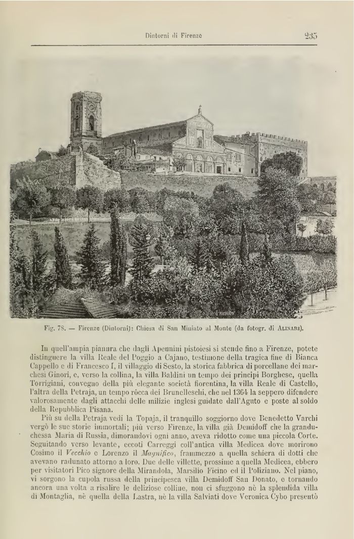 Più su della Petraja vedi la Topaja, il tranquillo soggiorno dove Benedetto Varchi vergò le sue storie immortali; più verso Firenze, la villa già Dcmidoff che la granduchessa Maria di Russia, dimorandovi ogni anno, aveva ridotto come una piccola Corte. Seguitando verso levante, eccoti Carreggi coli'antica villa Medicea dove morirono Cosimo il Vecchio e Lorenzo il Magnifico, frammezzo a quella, schiera di dotti che avevano radunato attorno a loro. Due delle villette, prossime a quella Medicea, ebbero per visitatori Pico signore della Mirandola, Marsilio Ficino ed il Poliziano. Nel piano, vi sorgono la cupola russa della principesca villa Demi do fi' San Donato, e tornando ancora una volta a risalire le deliziose colline, non ci sfuggono nò la splendida villa di Montaglia, nè quella della Lastra, nò la villa Salviati dove Veronica Cybo presentò