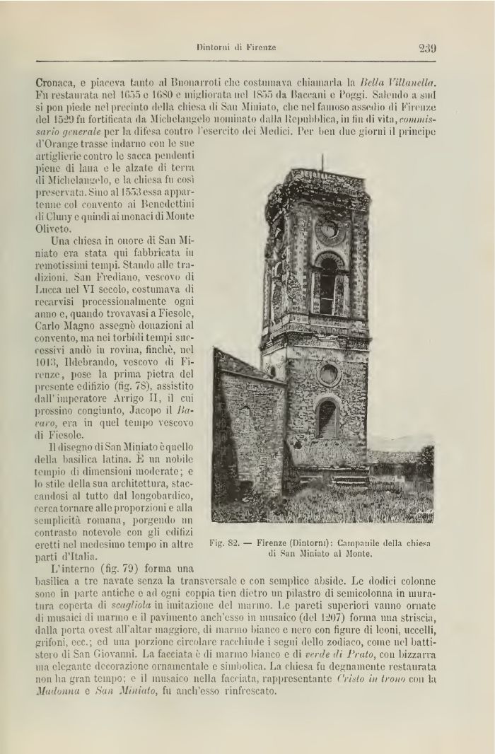 Una chiesa in onore (li San Miniato era stata qui fabbricata ni remotissimi tempi. Stando alle tradizioni, San Frediano, vescovo di Lucca nel VI secolo, costumava di recarvisi processionalinente ogni anno e, quando trovavasi a Fiesole, Carlo Magno assegnò donazioni al convento, ma nei torbidi tempi successivi andò ili rovina, finché, nel 1013, Ildebrando, vescovo di Firenze, pose la prima pietra del presente edilizio (fig. 78), assistito dall'imperatore Arrigo II, il cui pressino congiunto, Jacopo il Bai-aro, era in quel tempo vescovo di Fiesole.
