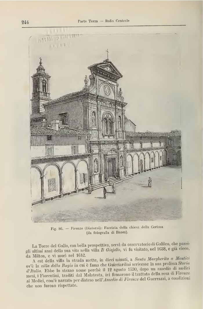 La Torre del Gallo, con bella prospettiva, servì da osservatorio di Galileo, che passò gli ultimi anni della sua vita nella villa II Giojello. vi fu visitato, nel 1G38, e già cieco, da Milton, e vi morì nel I(5i2.