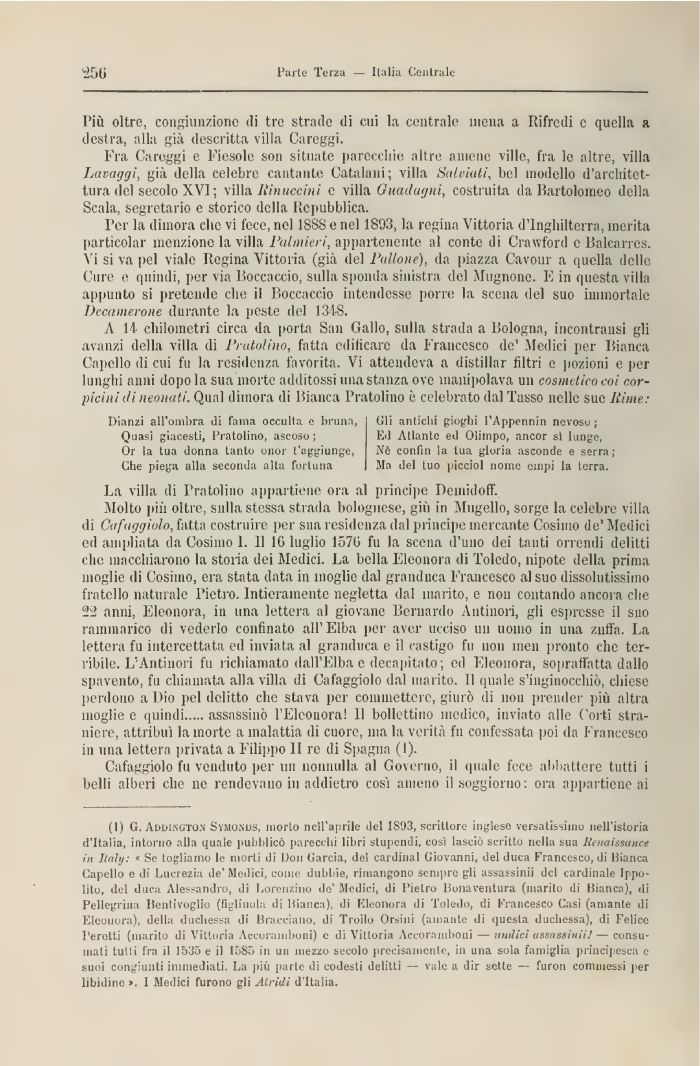 (1) G. àdmnswhn Symonus, morto nell'aprile del 1803, scrittore inglese versatissiino nell'istoria d'Italia, intorno alla quale pubblicò parecchi libri stupendi, cosi lasciò scritto nella sua Renaissance in Itahj: « Se togliamo le morti di Don farcia, del cardinal Giovanni, del duca Francesco, di Bianca Capello e di Lucrezia de'Medici, come dubbie, rimangono sempre gli assassinii del cardinale Ippolito, del duca Alessandro, di Lorenzino do' Medici, dì Pietro Bonaventura (marito di Bianca), di Pellegrina Iìentivoglio (figliuola dì Bianca), di Eleonora di Toledo, di Francesco Casi (amante di Eleonora), della duchessa di Bracciano, di Troilo Orsini (amante di questa duchessa), di Felice l'erotti (marito di Vittoria Accoramboni) e di Vittoria Accoraniboni — undici assassinii.' — consumati tulli fra d 1351 6 il 1585 in un mezzo secolo precisamente, in una sola famiglia principesca e suoi congiunti immediati. La più parte di codesti delitti — vale a dir sette — furori commessi per libidine ». I Medici furono gli Atridi d'Italia.